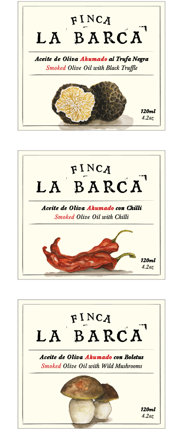 Illustrations for Finca La Barca packagings designed by in collaboration with Eduardo G.I. Finca La Barca is a family brand based in Spain who are expert in gourmet smoked products. I regularly do the illustrations for their new products and different packagings. The star product is the smoked Olive Oil, which won the Evooleum Best Olive Oil Packaging Design 2022.